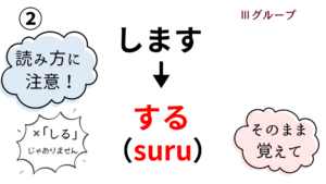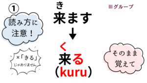 | Ⅲグループ | 来ます/します | 特殊 | 来る/する | そのまま覚える。読み注意。 |